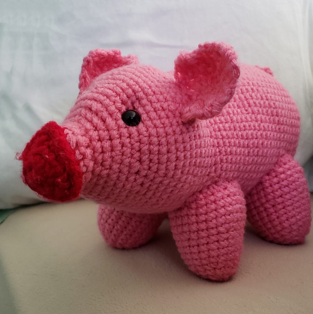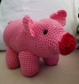 I found this pattern on Ravelry: Pig Amigurumi CAL pattern by Brenna Eaves. I liked it because it reminds me of a painting that Molly bought from a friend of hers. However, little pink pig did not pass muster and is still available to a loving home!