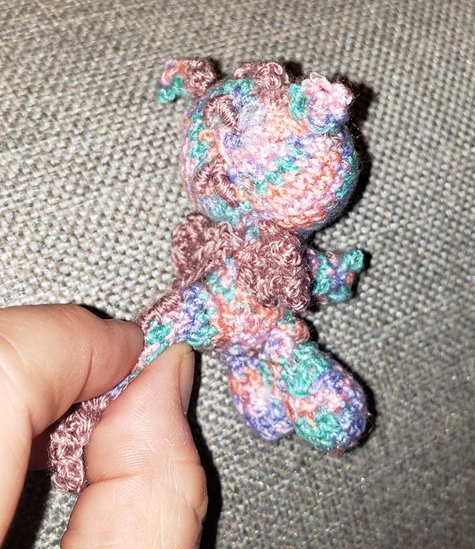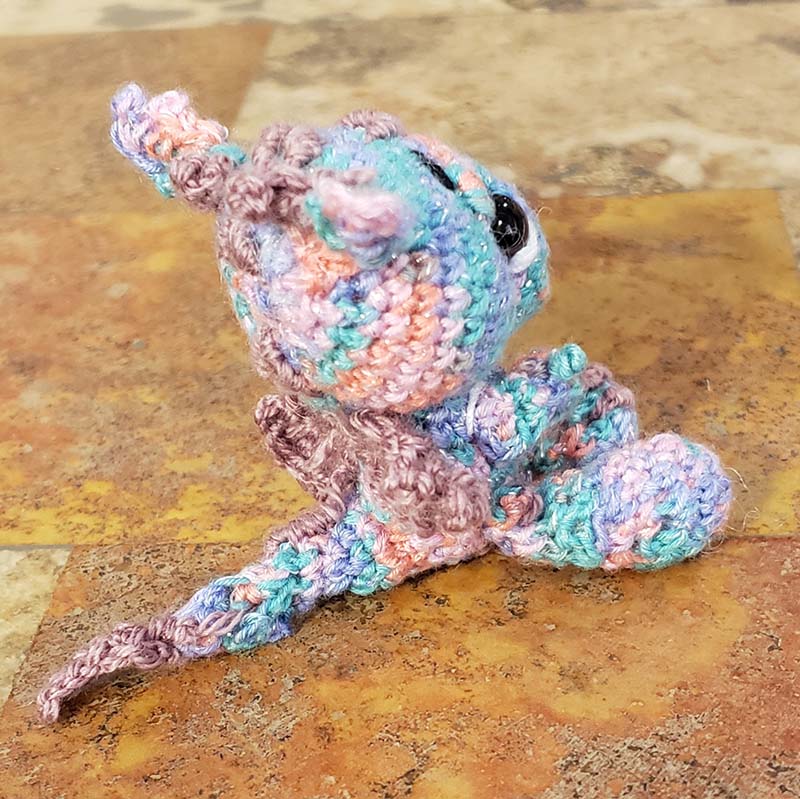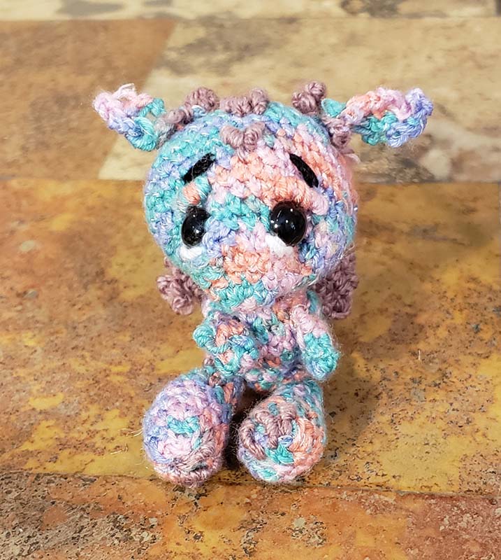 Fast forward several months, I had finished all my works-in-progress and decided to try it again using a much smaller yarn, but definitely still yarn. It was fingering/sock weight yarn called Summer Nights yarn in Tropical Fruit colorway. This one ended up being a little over 2″ I think. My daughter, Korinna, thought it turned out pretty cute and promptly adopted him.